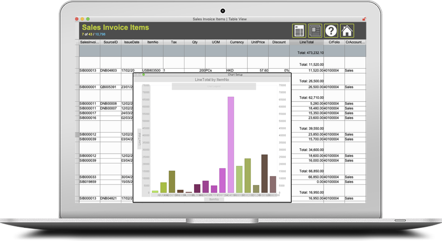 Analyze data with spreadsheet-like table view using FileMaker Pro's native reporting / charting functions; aggregate column number data (sum, average, max, min, etc); create eye-catching charts (bar, line, pie, area)