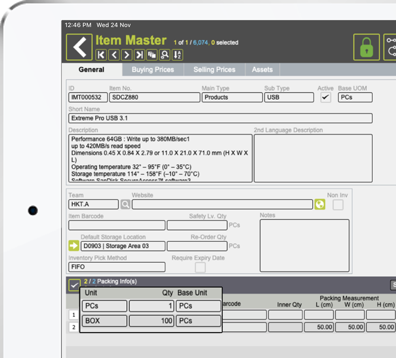 You can set up multiple UOMs with conversion rate to base unit under each product or material; enter inventory movement quantity in any registered unit and system will auto convert the quantity to base unit for reporting or stock taking purposes