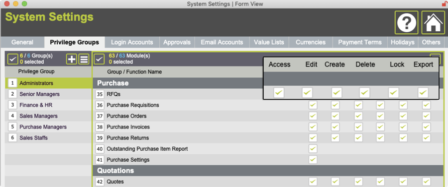 Organise users in privilege groups with different table level access restrictions (edit, delete, etc) to cater staff from different departments and levels. Classify records to allow / restrict access or hide sensitive field data for certain users